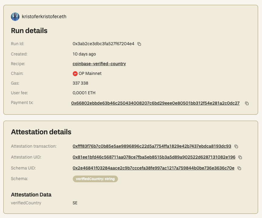 The payment transaction id, gas fees paid, the attestation transaction id, and the attestation uid, etc.